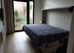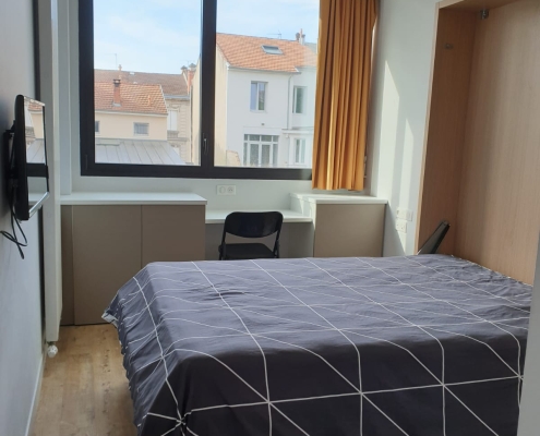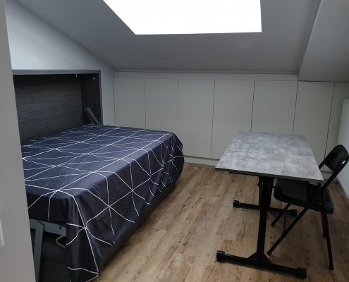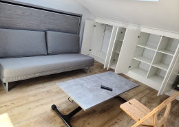 A tous moments, d’un simple geste, il devient chambre à coucher, grâce à son lit mural rabattable en 140.